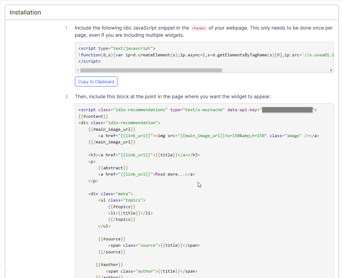 The second block of script is the code you would include in your page if you were not using the Recommendation Block. This script sets up the attributes required to connect to the Content Recommendation service to get the personalized content. On the `script` tag, the `data-api-key` is the ID of the delivery, that is used by the service to get the right content for the visitor. This is the pool of data in which the service will fetch personalized content for the visitor. The script included in the