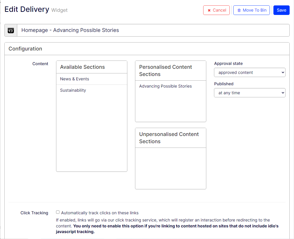 To deliver personalized content to our visitor, we must create and configure a delivery in the Content Recommendation administration screen. Creating a delivery is the process of selecting some content we want to deliver to our client and implementing the template that will render the content to out visitor. Content is selected by assigning one or more sections to the delivery. As we saw in the previous article, a section is a tag that is assign to some piece of indexed content bases on a series of criteria, known as flows. When a content editor creates a new page in which he wants to include a personalized content delivery, the id assigned to the delivery when created, will be used to include this delivery into our page. The id used in the page will tell the Content Recommendation Service into which delivery it can fetch and choose its content from.