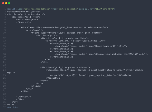 is the Mustache template that will render the markup that will be served to the visitor. This template is repeated for each recommendation item that is returned to the visitor.