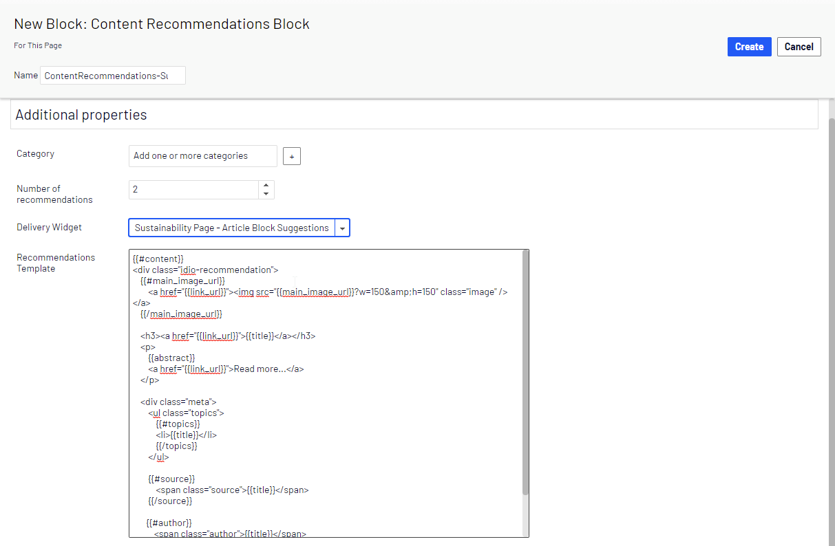 A second option that can be used is to inherit the recommendation block. This option is a good way to facilitate the recommendation block use for content editors who don’t understand the mustache template. On this implementation, we could hardcode the rendering template of offer a selection of prepared mustache templates. If the template is pre-configured, we could hide them from the content editor to prevent some editor to mess with the actual template markup. Another option could also be to bind a delivery using its ID and add some option to customize the mustache template rendering.
