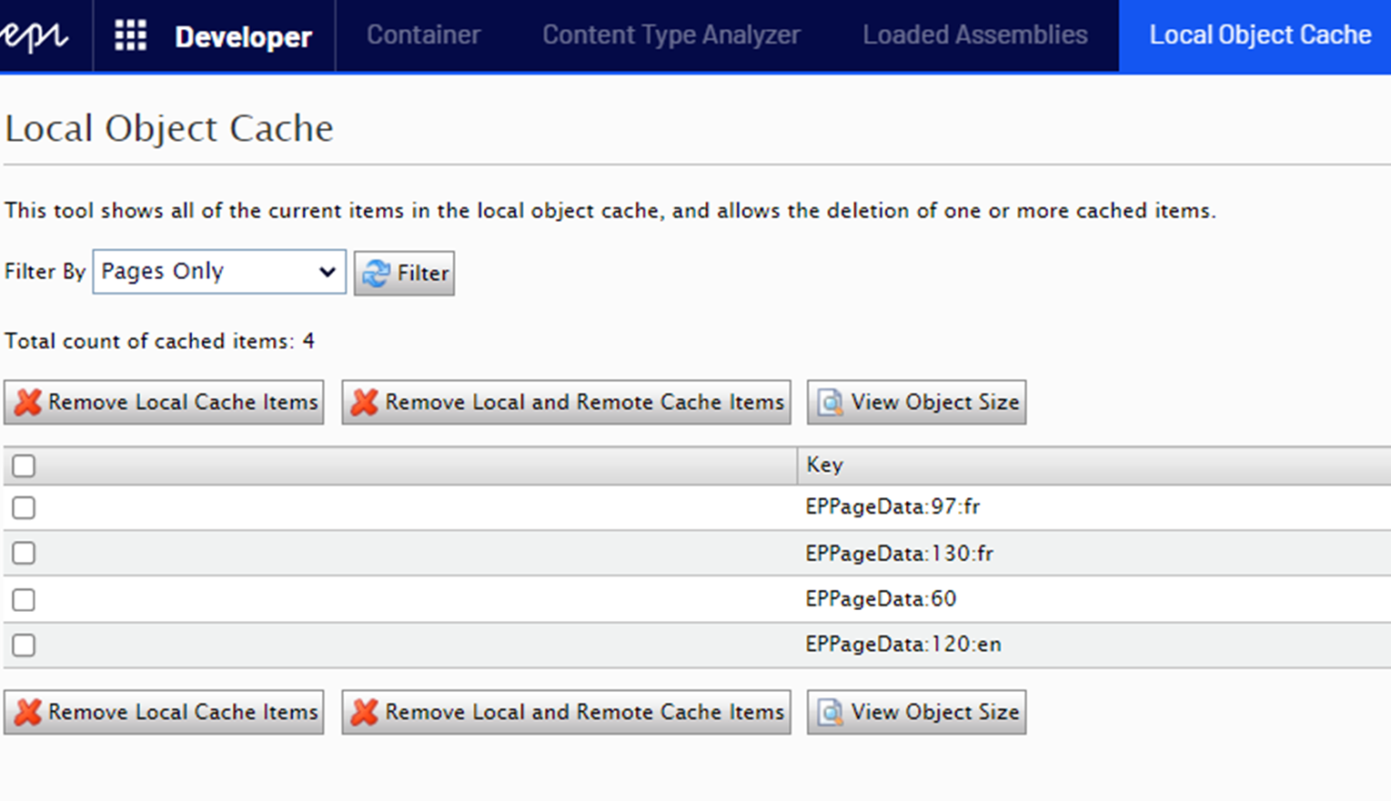 The first thing we can do is to install the Developer Tools addon. This addons adds some developer-oriented functionalities to an Optimizely site. The functionality that interests us the most in our context is the Local Object Cache. This functionality shows all the current item in the local object cache. It also allows us to delete some items if we run into cache issues.