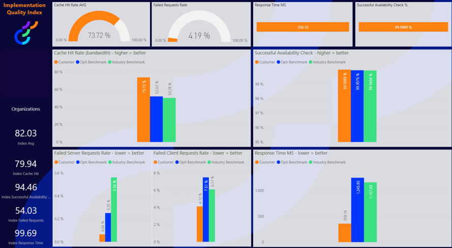 One tool that we have to measure the impact of the caching techniques that we apply to our site is the Implementation Quality Index provided by Optimizely. This report gives us a series of metrics for our site, compared to Optimizely and Industry benchmarks.