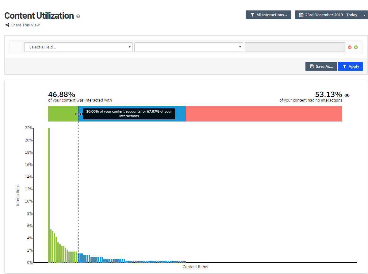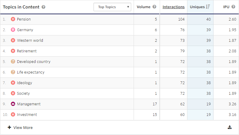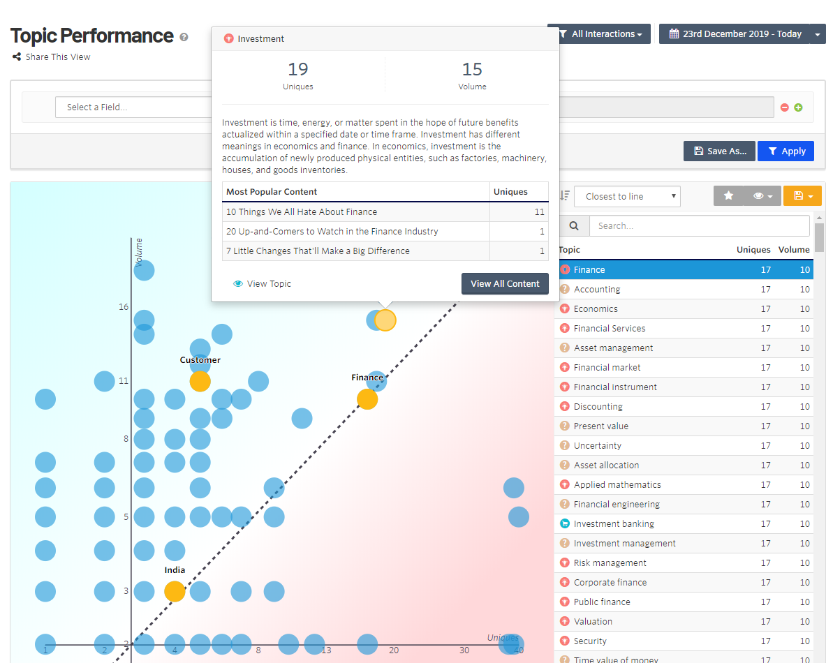 The Topics in Content shows the number of interactions with content in which a topic appears. This can help you measure if your content and topics are consumed as you expect them to.