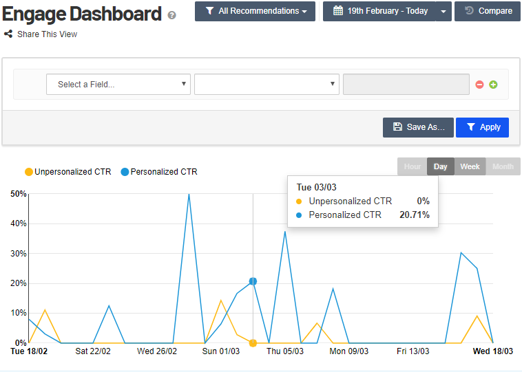 The Engage Dashboard shows the deliveries performance. Deliveries are used when we want to render content to a visitor based on previous interactions and its interests based on analytics.