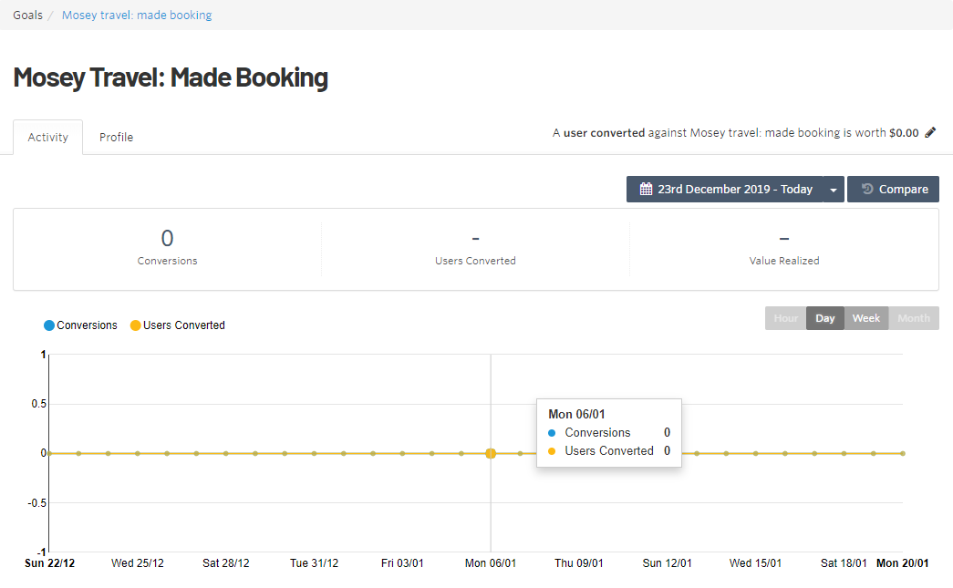The Goals dashboard shows conversions. Goals are interactions that you want your visitor to perform. Example of goals could be to fill a form, download a document, view a specific number of pages in a section. Goals tracking can help you see if you content is engaging people.