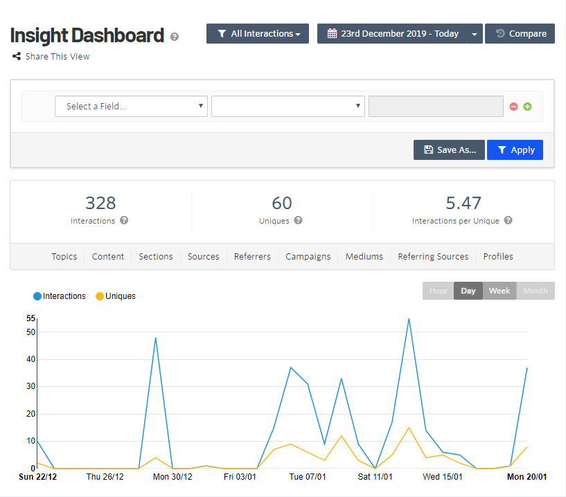 The Insight Dashboard shows us how topics perform based on the interactions (views on page), the unique IP addresses that visited the site and the interactions per unique visitors.