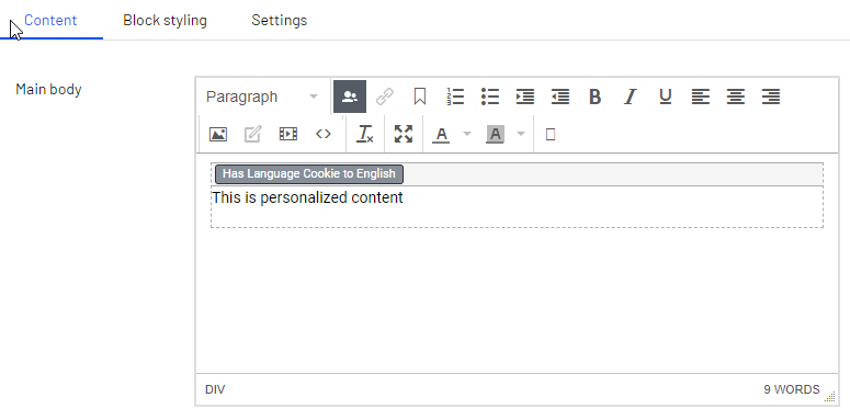 To apply a visitor group to a piece of content, you need to open it in edition mode. Then, from the editor toolbar, you can choose the Personalized Content option.