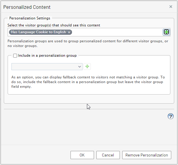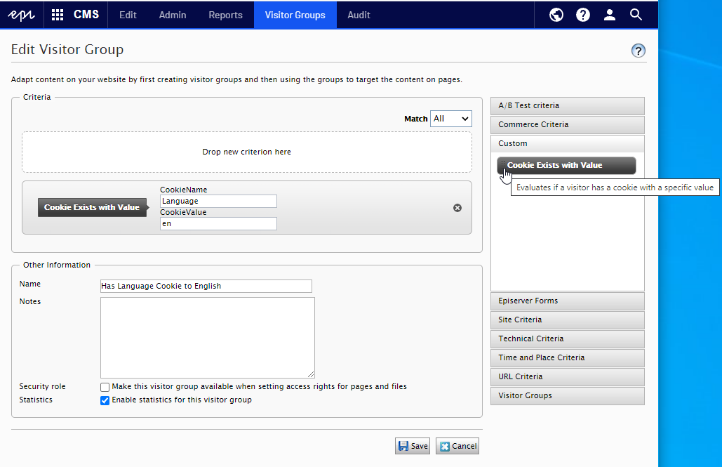 If the provided set of visitor groups doesn't fulfill your customer needs, you can implement your own visitor group criteria. Let’s say you want to personalize some content based on a value stored in a cookie. We will take this example to go through the steps to implement a custom visitor group. Let’s implement a visitor group that evaluates if a visitor has a specific cookie and value.