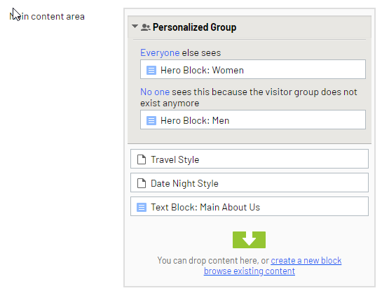 You might be developing a personalization strategy with a client, and you have defined some visitor characteristics on which we want to personalize some piece of content. Those user’s information will allow you to split users into groups or segments. So now that we have identify some visitor segmentations, how can we use them to personalize the user experience? Visitor groups can be used to conditionally render content on a page based on those segments.
